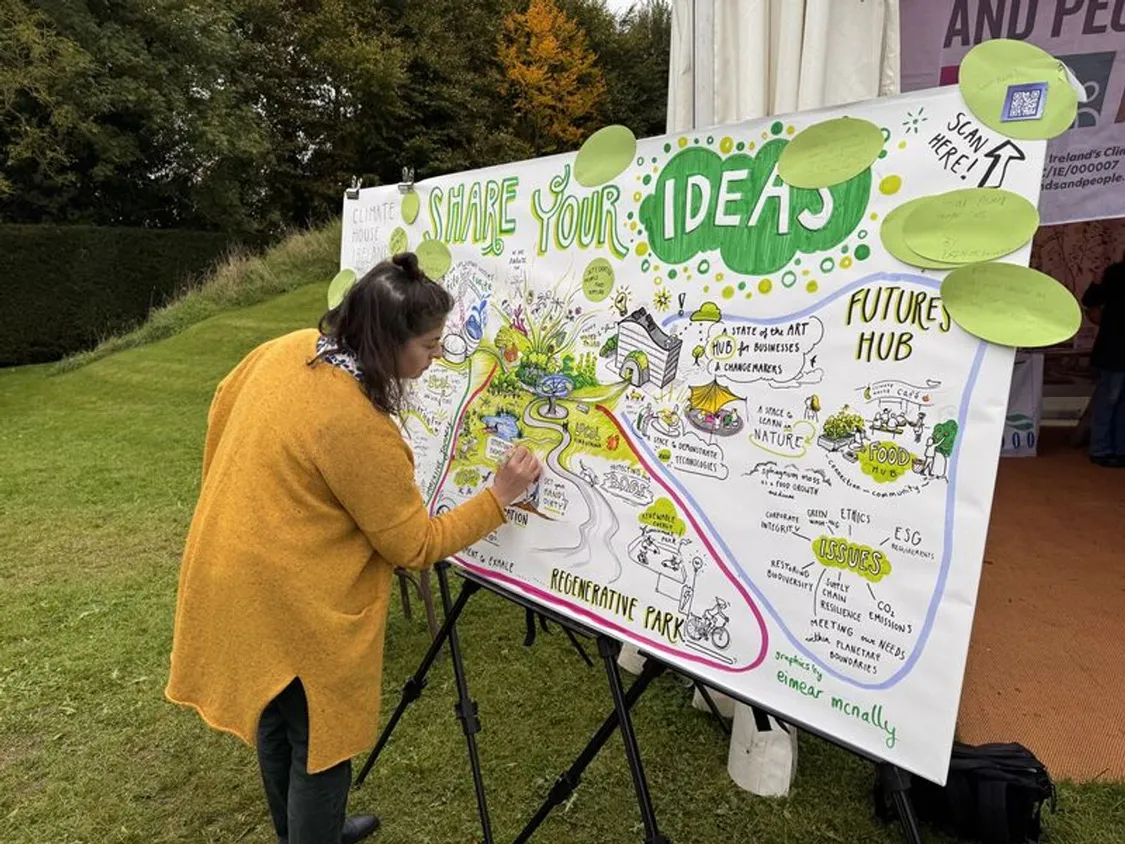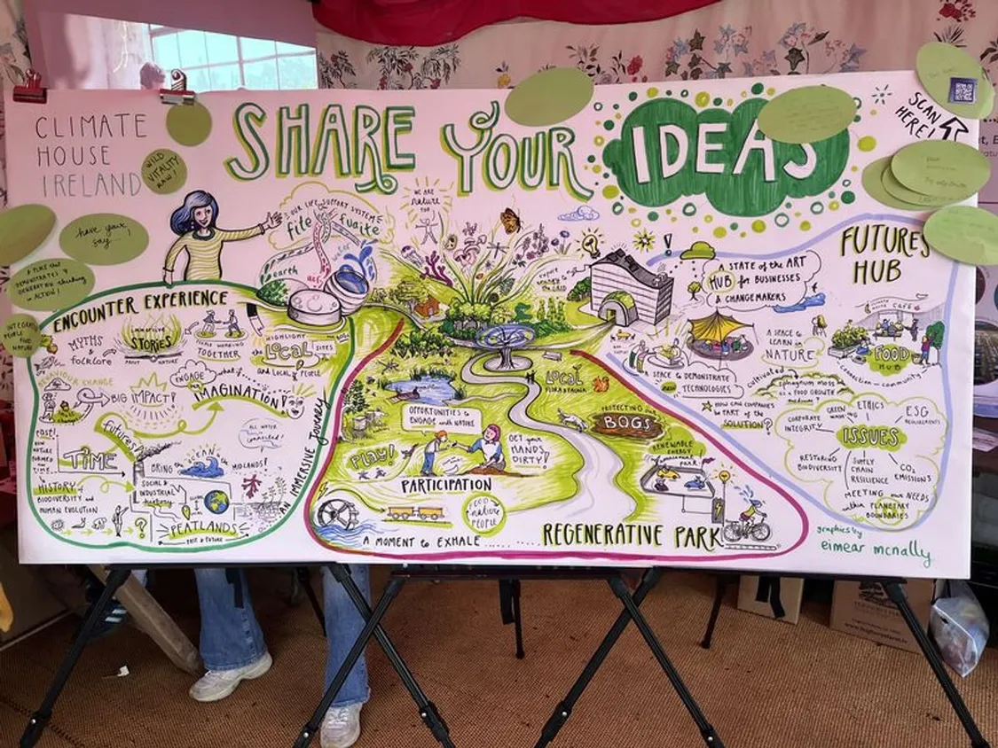 Our social and cultural catalyst invited participants to share their thoughts and ideas for Climate House Ireland - a new initiative to create a home in the Midlands dedicated to Ireland’s climate and nature action. Illustrator Eimear McNally brought people’s ideas and insights to life throughout the day, producing a stunning live artwork that captured the creativity and optimism of the crowd.